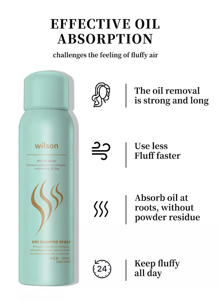 Wilson Instant No-Wash Cool Dry Shampoo Spray Formula unik kaya dengan bahan-bahan semulajadi, bebas daripada bahan kimia yang berbahaya, kulit kepala yang lembut dan tidak mengiris, dengan berkesan menyerap minyak yang berlebihan, supaya rambut untuk memulihkan bersih dan ringan. Sama ada anda dalam perjalanan, dalam keadaan kecemasan atau selepas hari yang sibuk, Wilson segera meninggalkan syampu kering sejuk adalah alat penjagaan rambut yang mudah dan praktikal untuk memastikan rambut anda segar dan bersih, dan rambut anda kelihatan dan berasa hebat pada bila-bila masa, di mana sahaja.